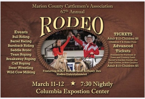 Cattlemen's Rodeo Share: Name: Cattlemen's Rodeo Date: March 11, 2022 - March 12, 2022 Event Description: Marion County Cattlemen's Association Rodeo Event Media: To Current Calendar Location: Columbia Expo Center Hwy 35 ByPass Fees/Admission: Advanced Tickets: Towne & Country Feed & Barrett's Garden Center Adults $10 Children $5 Under 6 FREE At Door: Adults $12 Children $6 Under 6 FREE Set a Reminder: Enter your email address below to receive a reminder message. -- Select Days Before Event -- 1 Day 2 Days 3 Days 1 Week Captcha Validation Please complete the Captcha To Current Calendar